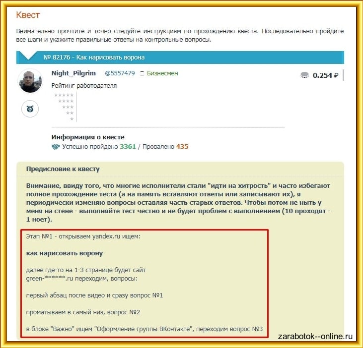 Более интересный вид задания, за который платят 0,25 рублей. В сутки доступно 5-10 квестов, а значит минимальный заработок на SEO-sprint в этой части составит 5*0,25=1,25 рублей. По времени прохождение одного квеста занимает 1-2 минуты.